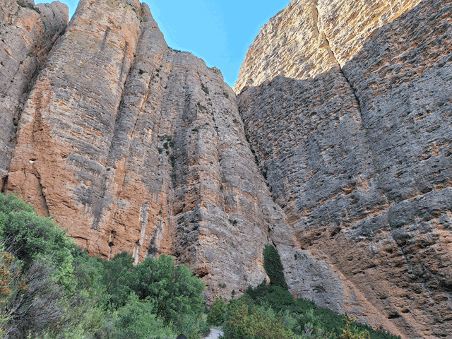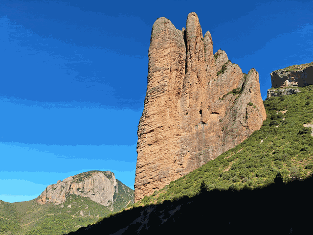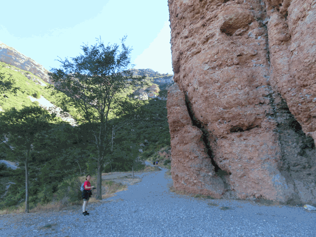 El sol está ahora mismo tras el gran mallo Pisón, 275 metros por encima de nuestras cabezas. Nos proporciona sombra en el primer tramo de la excursión. Pero os aseguro que las fotos no le hacen justicia. Estremece ver esta mole tan de cerca. Es como un gigante poderoso e inmóvil que se yergue a tu lado, incluso parece algo amenazante. Uno se siente pequeño junto a este gran farallón de conglomerado.