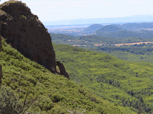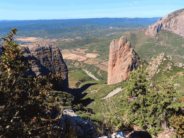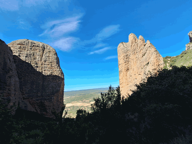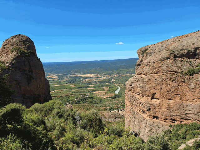 Desde aquí la vista es formidable. No sólo se ven los mallos Pisón y Firé perfectamente, sino que entre ambos, como si fuera una enorme ventana, se observa la llanura de la Hoya de Huesca, y sobre ella, el río Gállego, dibujando curvas sobre los campos como si fuera una enorme serpiente de color azul.