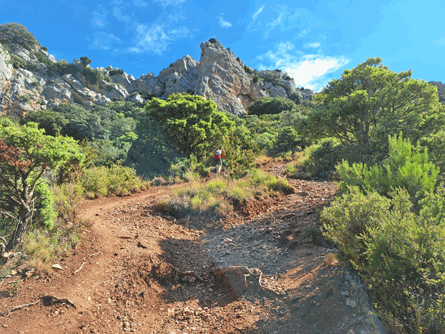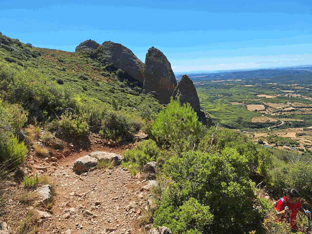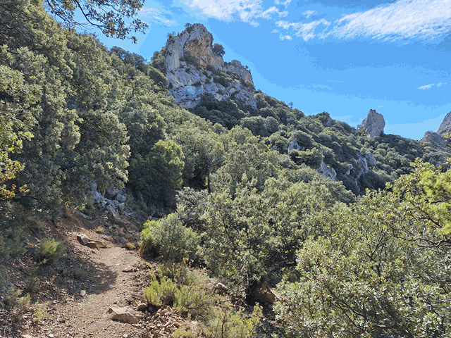 Ahora seguimos descendiendo con algo más de pendiente. El firme, descompuesto, con piedra suelta, pero llevadero. A nuestro alrededor otros mallos menores en tamaño, pero también tienen su encanto, surgiendo de entre una especie de mar verdoso de matorral.