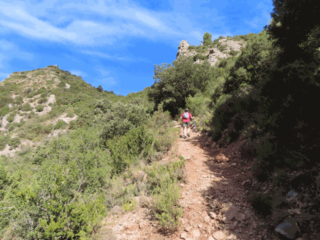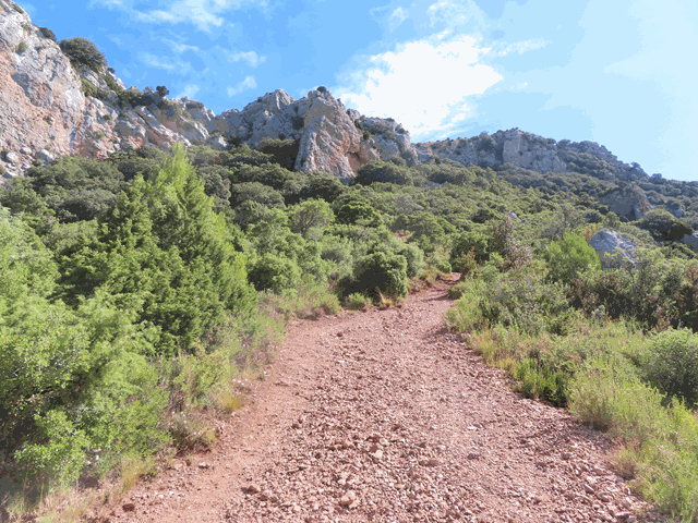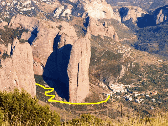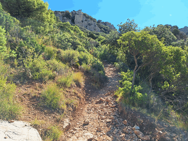 La senda asciende rápidamente desde la base de los mallos entre una frondosa vegetación de matorrales, encinas y bojes, por un terreno de abundante piedra suelta, por eso es mejor subirlo que bajarlo, por lo penoso que puede resultar el descenso.