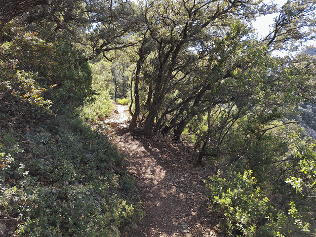 El sendero ahora gira hacia la derecha, y llanea ligeramente entre encinares. Después de venir de caminar por una zona donde lo que predomina es el arbusto, atravesar este tramo resulta muy agradable.