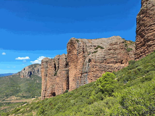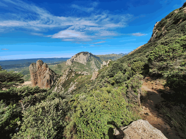 La senda va descendiendo entre el matorral y va dibujando amplias zetas. Ahora tenemos una visión un poco más alejada del mallo Colorado desde su base, pero también de los mallos tras él, que en un bonito efecto óptico, forman una gran muralla de piedra cuyo final es la Peña Rueba. Ahora es cuando realmente tengo la sensación de estar cerrando la circular.