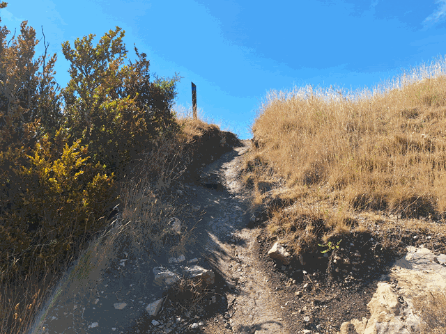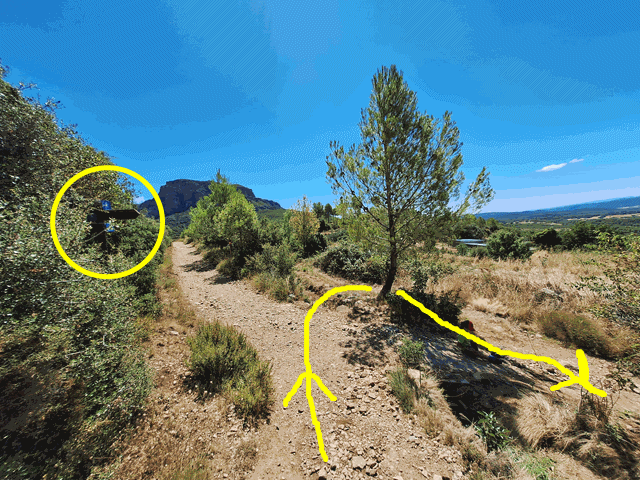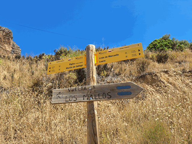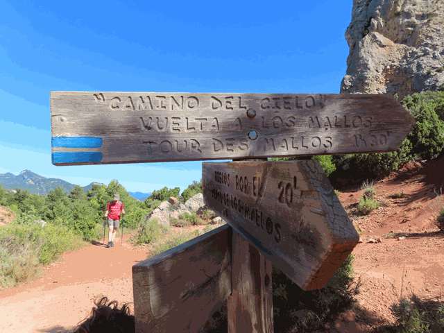 Una vez en el collado nos encontramos con unos postes de dirección. Uno de ellos dice «camino del cielo, vuelta a los mallos 1,30 horas» y nos envía hacia la derecha en clara subida. Obviar otros senderos como el que nos lleva a La Peña por Escalete.Aquí abandonamos definitivamente el PR-HU98.