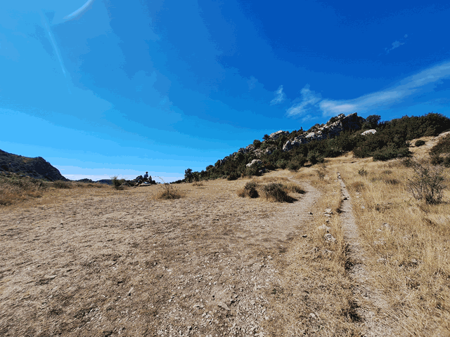 Enseguida la senda deja de ser horizontal para iniciar un nuevo tramo en subida, de nuevo entre el abundante matorral. Volvemos a ver las marcas azules de la ruta circular.El camino parece conducirnos a una zona que da la impresión podría ser plana, algo más arriba de nuestra posición.