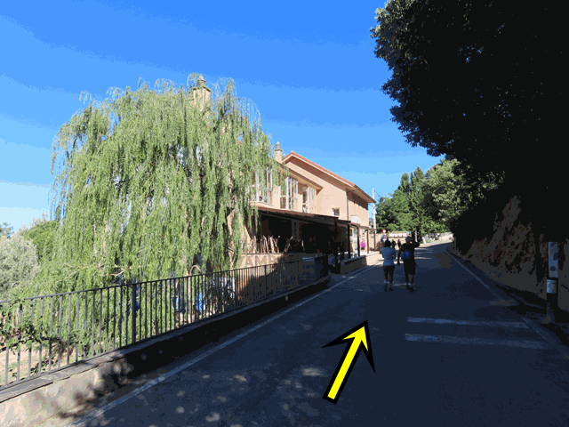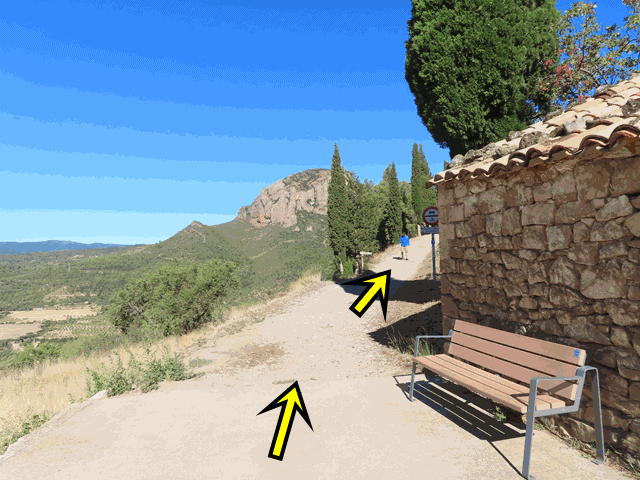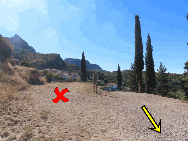Casi inmediatamente, salimos de las calles asfaltadas del pueblo y llegamos a un amplio camino de tierra. Dejamos una construcción de piedra y un banco a la derecha y seguimos recto hacia una zona en la que hay unos cipreses bordeando la senda, tal y como se ve en la foto.