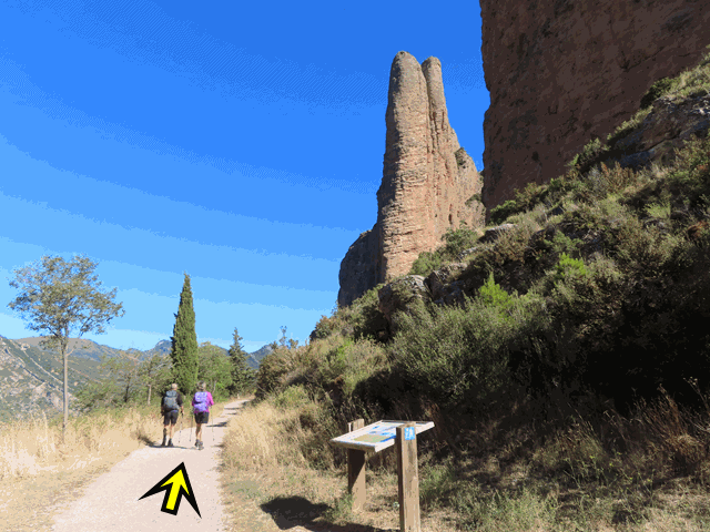 Seguimos caminando todo recto y sin desviarnos, dejando el último aparcamiento y los paneles a la derecha de la marcha. Los los murallones de los Mallos están cada vez más cerca.