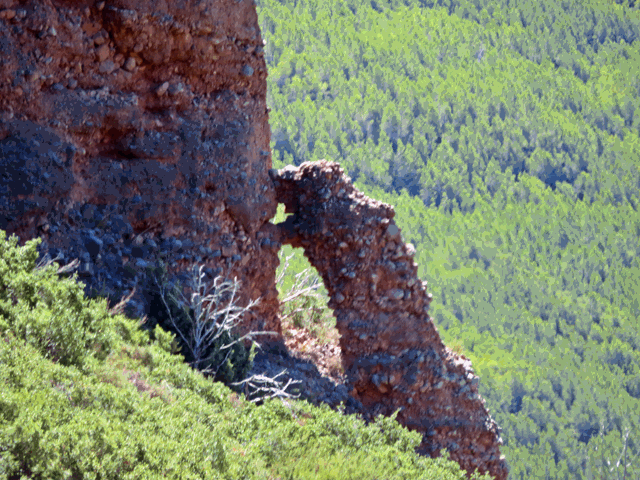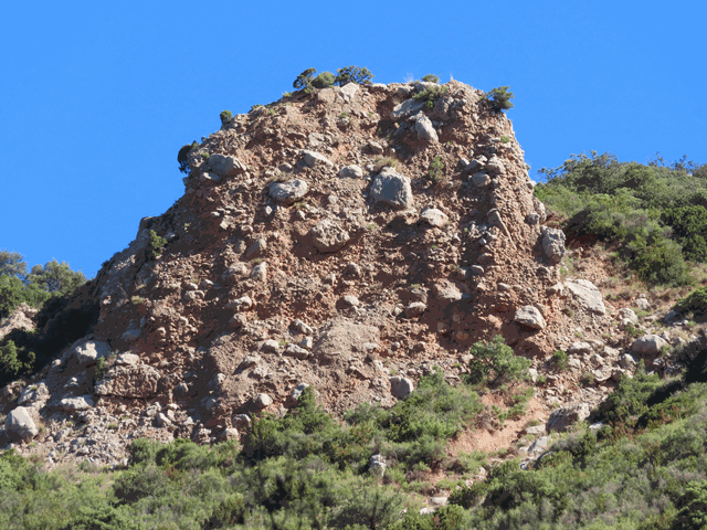 A medida que voy ascendiendo por esta senda puedo ver a mi derecha, arriba, un gran montículo totalmente desprovisto de vegetación donde se puede apreciar perfectamente el conglomerado y los bloques de piedra de diferentes tamaños cimentados entre sí.