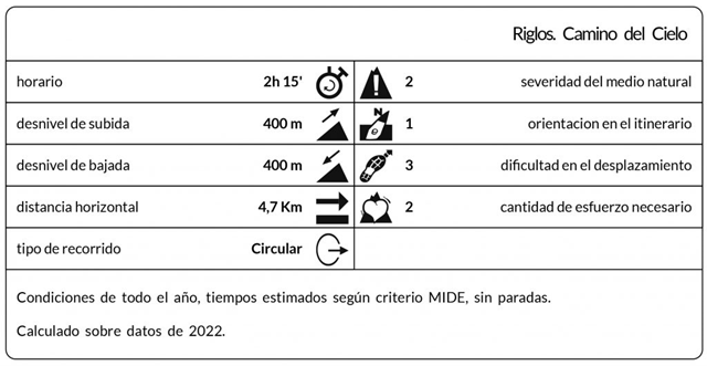 Os dejo también el MIDE de la ruta. Los datos difieren algo de los que he calculado, es algo menos de tiempo y distancia que lo que me salió a mí pero pueden servir. En cuanto a severidad del medio, dificultad en desplazamiento y esfuerzo necesario, se ajustan a lo que he experimentado en esta caminata.
