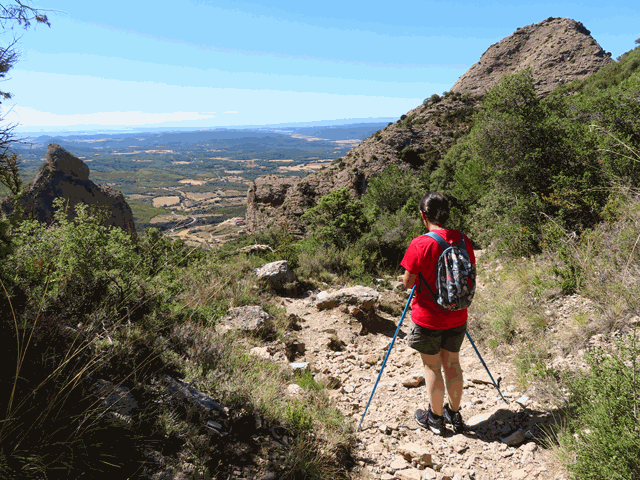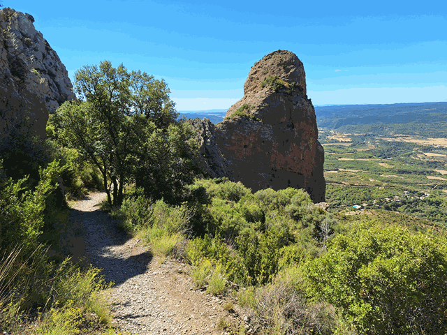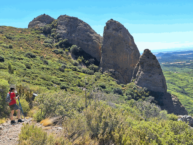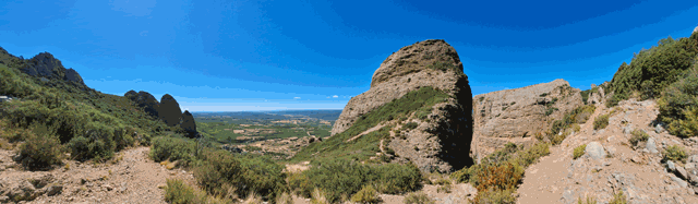 Poco a poco, a nuestra derecha, las encinas van desapareciendo y podemos disfrutar de una formidable vista del mallo Firé y de Peña Rueba. ¡Qué abajo se ven! verdaderamente hemos subido unos cuantos metros de desnivel desde que iniciamos la caminata en Riglos.