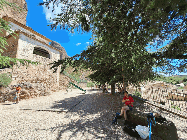 Y tras hora y media desde que dejamos el mirador de Bentuso, y una hora desde el mirador del Colorado, llegamos al casco urbano de Riglos. Ahora toca comer algo y descansar. Iremos a un parquecillo que hay en el pueblo, junto a la iglesia.