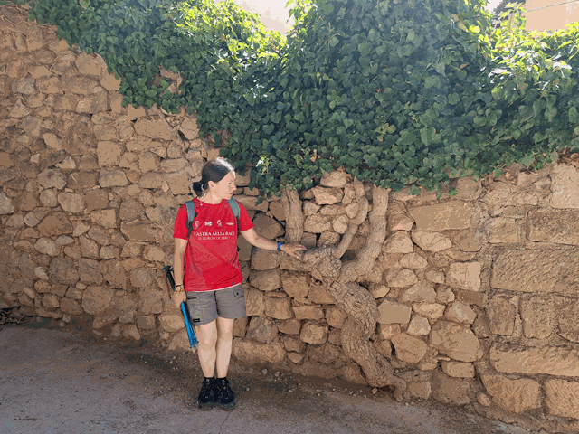 Una vez hemos descansado, decidimos ir volviendo hacia el coche. Vamos bajando por las calles de Riglos, donde encontramos un muro con un curioso árbol que parece encastrado en sus piedras.
