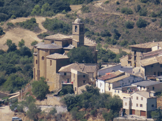 Pero no sólo se ve desde aquí parte del casco urbano de Riglos, sino a lejos en el horizonte, la población de Murillo de Gállego. Con el zoom saco una foto de su iglesia, la parroquia de San Salvador, consagrada en el año 1110.