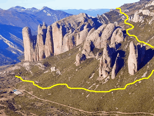 Seguimos avanzando próximos a la base de los mallos y pronto alcanzamos un pequeño llano en el que nos cruzamos con el sendero PR-HU 98, identificado con marcas amarillas. Desde este punto podemos contemplar a la izquierda al fondo Peña Rueba y más cercano, el mallo Firé.