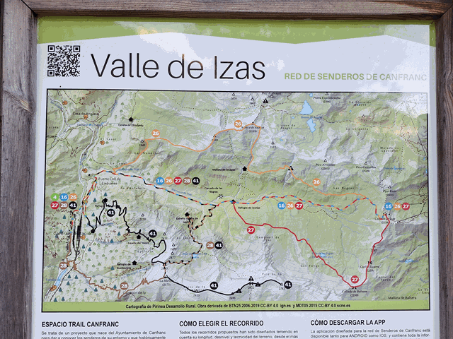 En uno de los paneles informativos se indican las diferentes rutas que se pueden hacer por el valle de Izas; como la Cascada de Las Negras y el ibón de Iserías (2.155 m) .