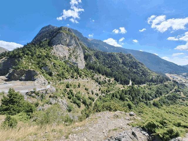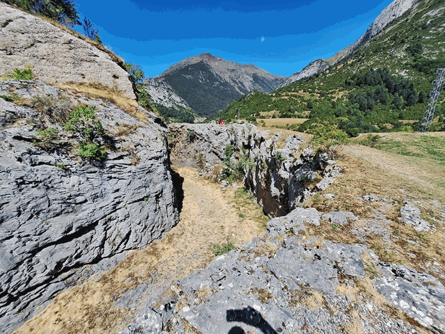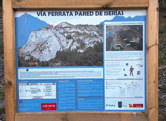 Y a nuestra derecha se deja ver la enorme Pared de Iserías, impresionante mole calcárea, donde hay habilitada una reciente vía ferrata inaugurada el 10 de agosto de 2024. Tiene una longitud de 410 metros. El inicio de la misma se encuentra junto a la pista de Coll de Ladrones.