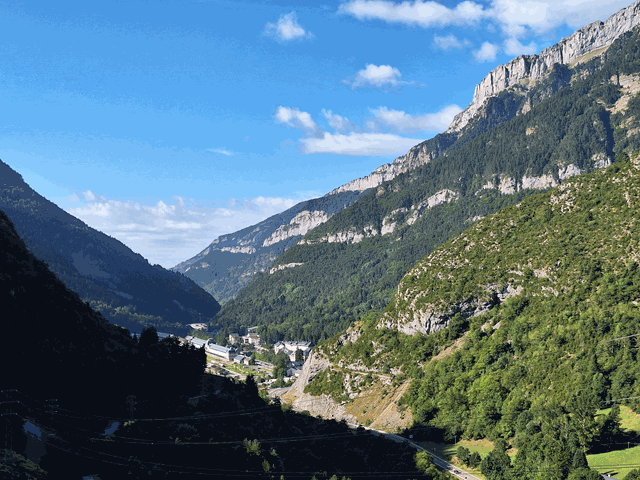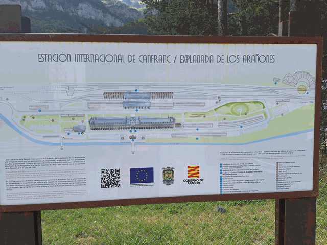 Desde aquí, volviendo la vista hacia atrás, se ve bien abajo de nuestra posición el pueblo de Canfranc Estación, donde está ubicada la impresionante estación de tren que exteriormente sigue los modelos de la arquitectura palacial francesa del siglo XIX, que fue inaugurada el 18 de julio de 1928 por el Rey Alfonso XIII, y que ahora luce reconvertida en hotel de lujo desde el año 2023. Convive con la nueva estación de viajeros, que se inauguró el 15 de abril de 2021 rehabilitando parcialmente dos antiguos hangares de mercancías.