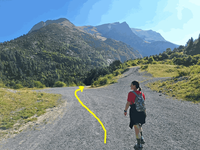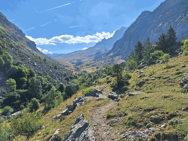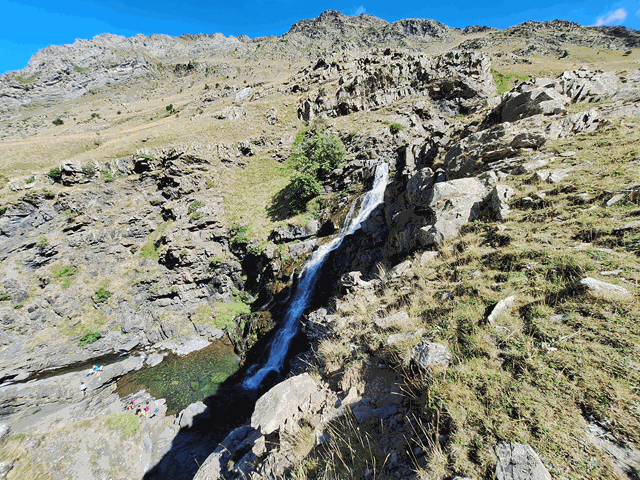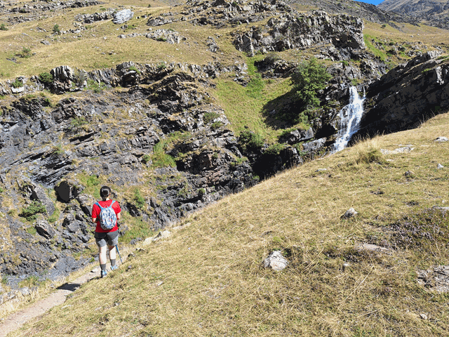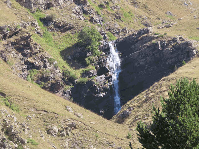 Hemos dejado a nuestra derecha un sendero que nos conduciría, de seguirlo, hasta el Ibón de Iserías. Nosotros continuamos por el camino paralelo al barranco de Izas. Una vez cruzado el segundo torrente, tendremos que remontar una pequeña loma que nos situará justo enfrente de la cascada.