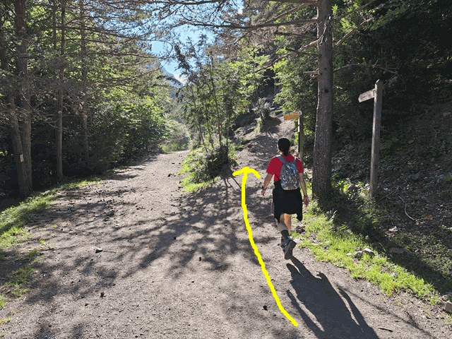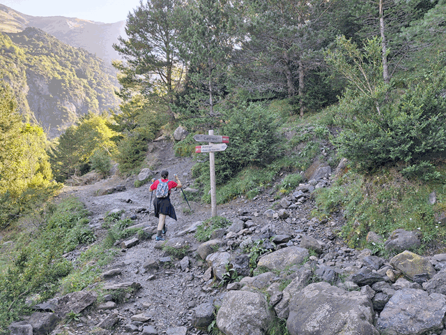 La senda nos lleva a continuación por una zona de bosque bajo y arbustos, que no presenta prácticamente desnivel. De nuevo, aparece un tercer poste de dirección que nos confirma que vamos por el buen camino, hacia el ibón de Iserías y Formigal.