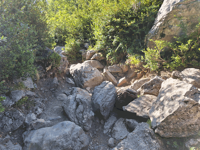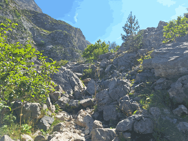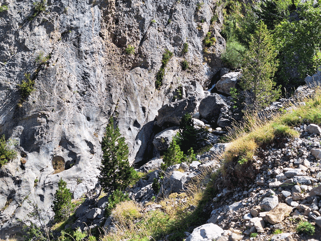 La verdad es que esta zona es bastante árida, hay roca viva desprovista de casi todo tipo de vegetación salvo por algo de hierba y unos pocos arbustos y árboles aislados. Y cuanto más arriba miramos el color predominante es el gris de la roca.