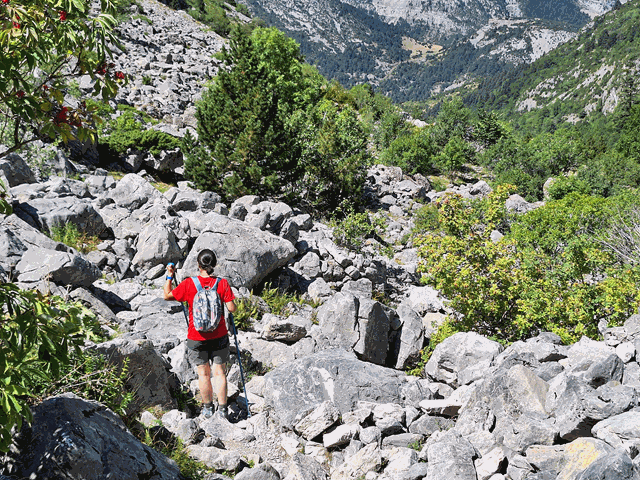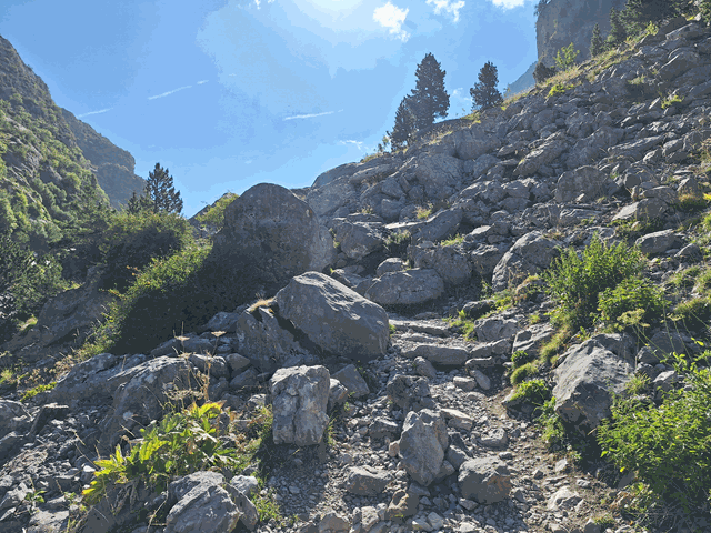 Superado este primer tramo, la pendiente se va haciendo más pronunciada hasta llegar a una zona de bloques de piedra llamada «La Cantalera». Es un canchal o glera de extensión considerable. El barranco de Izas queda a nuestra izquierda. Esta es quizás la parte más dura del recorrido por lo incómodo del camino y la cantidad de piedras sueltas que se tienen que atravesar.