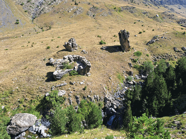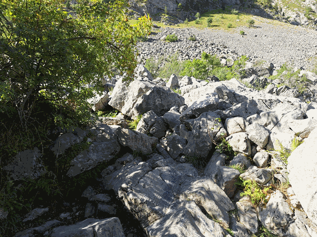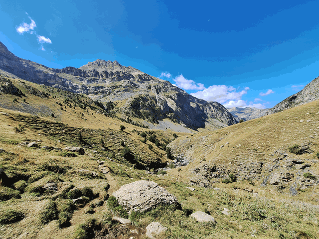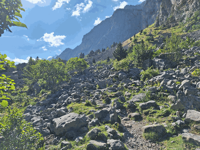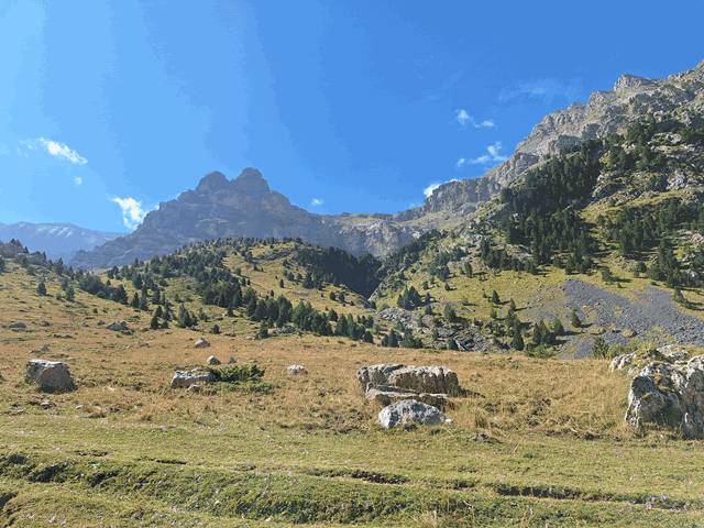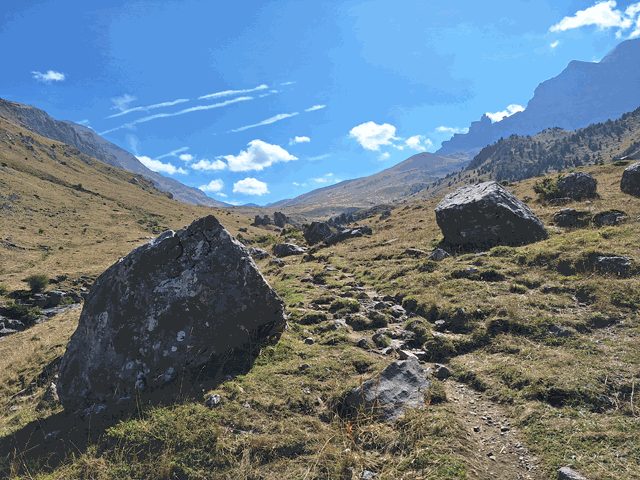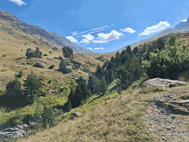 Poco a poco vamos ganando altura respecto al torrente principal. En su margen derecha geográfica, un poco por encima del cauce, aparecen unos grandes bloques de piedra que destacan sobre la pradera. No se trata de ningún antiguo desprendimiento, son sencillamente restos de bloques morrénicos que hace miles de años arrastró el glaciar y que fueron arrancados de su ubicación original.
