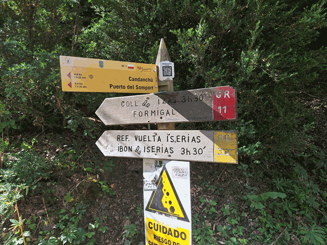 Vamos ahora ascendiendo por la senda y a los pocos metros vemos otro segundo poste indicador en el que dice como ir a Formigal por el GR-11 que es por donde debemos continuar.
