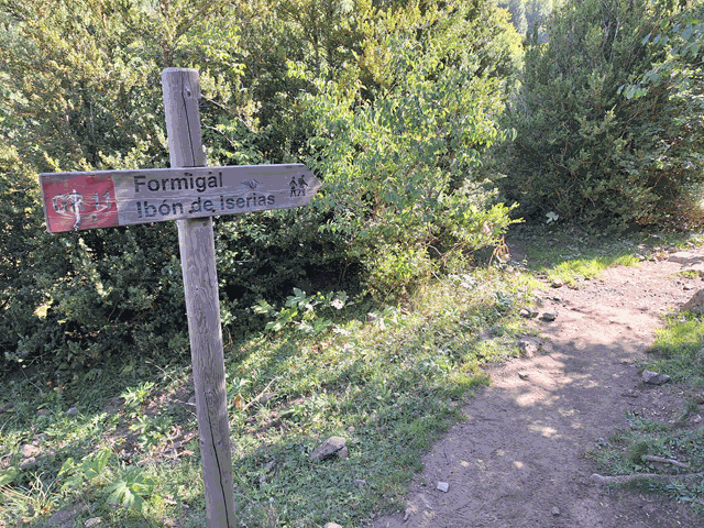 El poste marca el GR-11 con dirección a Formigal a través del collado de Izas. En los carteles no aparece «valle de Izas» propiamente escrito, sino que pone Formigal, Collado de Izas y Refugio e Ibón de Iserías, pero hay que seguir por ahí.