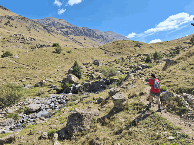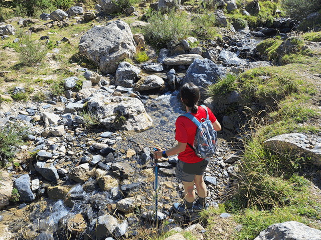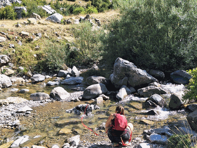 A nuestra izquierda podemos ver el torrente que baja por la Canal de Izas. A veces parece un pequeño río de montaña ya que adquiere cierta anchura sobre el terreno, no así profundidad. En este punto vemos como la senderista aprovecha para que su mascota se refresque en el agua fría.