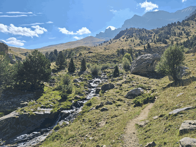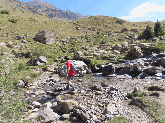 De pronto, y por las características del terreno, la cascada deja de verse a medida que se avanza, pero la senda bien marcada está ahí. No hay hitos ni señales, pero no hacen falta, es muy evidente, al menos en verano, en el invierno y con nieve ya será otro cantar. El camino se dirige directo a cruzar el segundo torrente.