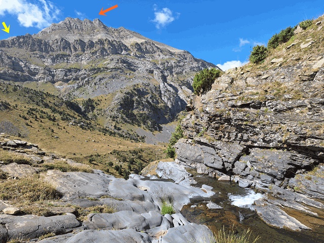 La vista que tengo del horizonte cercano es perfecta desde aquí. En la foto de debajo, os he puesto dos flechas, la de color amarillo señala el pico de La Moleta (2.572 m) casi escondido, y la flecha naranja señala los picos de Iserías (2.282 m).