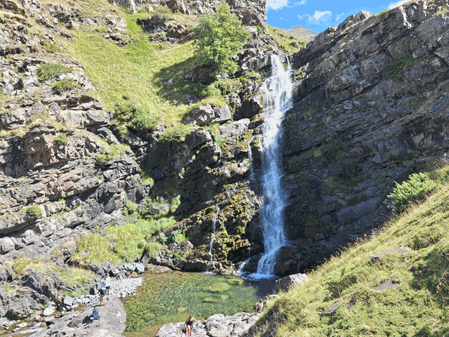 Tengo curiosidad. Todavía no hemos llegado pero con el zoom saco la cascada de cerca. Efectivamente entiendo que la llamen «Las Negras» por las rocas oscuras del entorno.Los estratos rocosos están inclinados hacia la izquierda. Da la sensación de que el agua también debería ir hacia ese lado, pero es un efecto óptico.