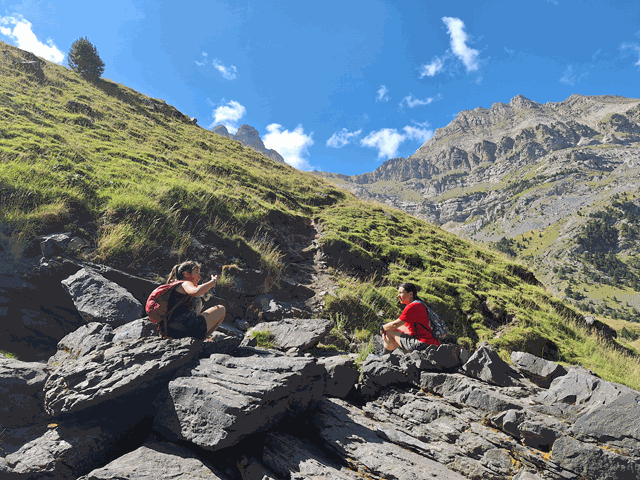 Tras una hora de caminata y habiéndonos despedido de la Cantalera definitivamente y sumado otros 100 metros de desnivel a la excursión, llegamos a la Canal de Izas. El paisaje que aparece frente a nuestros ojos no tiene nada que ver con lo que hemos observado hasta ahora; bonitas praderas escoltadas por murallones de piedra a derecha e izquierda que te hacen sentir pequeño ante semejantes moles. Todo el conjunto dibuja sobre el horizonte el perfil característico del antiguo valle glaciar en forma de U.