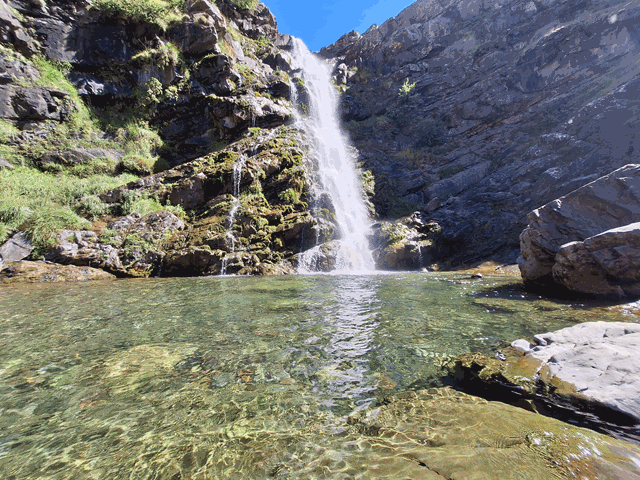 Tras casi dos horas de marcha desde el inicio, ahora toca disfrutar de las vistas y descansar brevemente en la zona alta de la cascada antes de descender a su base. Aquí no se escucha nada salvo el sonido que produce el agua al precipitarse al vacío.