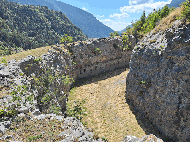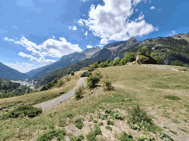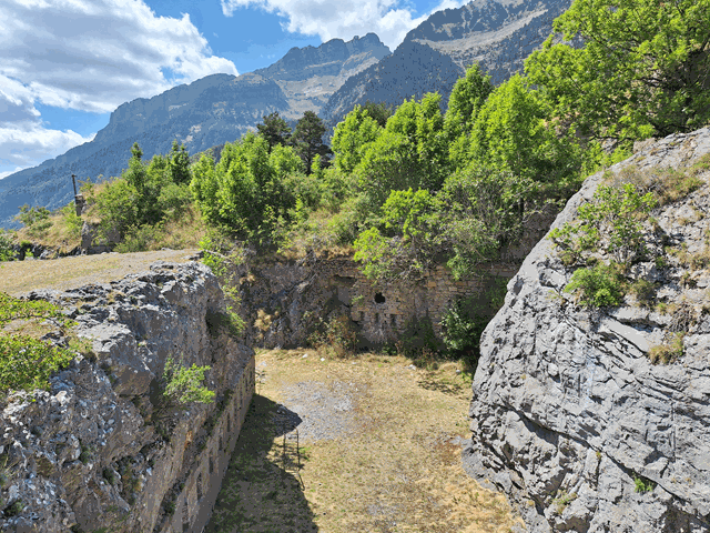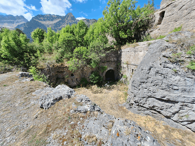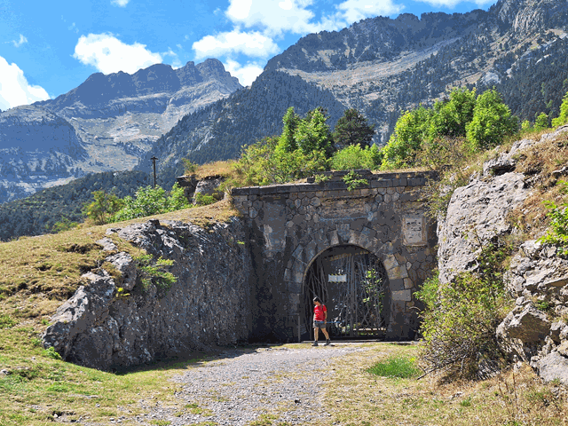 A medida que la pista va dejando el bosque y recorre una zona más despejada, vemos a lo lejos, en lo alto, el fuerte Coll de Ladrones. Es un fuerte fusilero del siglo XIX edificado sobre peñascos a 1351 metros de altitud. El fuerte cierra el paso del valle de Canfranc hacia la frontera francesa, constituyendo un perfecto ejemplo de arquitectura militar moderna adaptada a un terreno montañoso.Como complemento al fuerte, se construyó junto a la carretera valle abajo, la Torreta de los Fusileros.