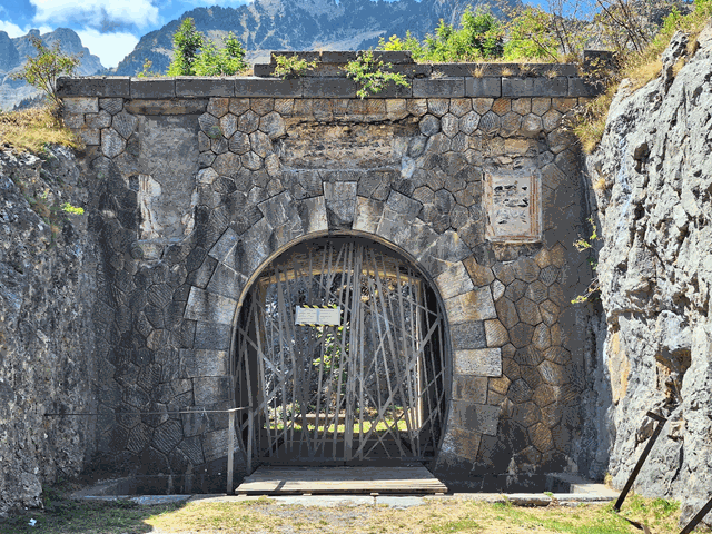 Pero enseguida y a medida que vamos avanzando, podemos ver un arco de entrada que me recuerda a la de un túnel y que aparentemente conduce a una especie de enorme trinchera. Está cerrada, pero no es una puerta al uso, han colocado unos barrotes decorativos de lado a lado. Bajo nuestros pies, un pequeño puente levadizo que salva un foso. Esta es la puerta oriental del fuerte Coll de Ladrones.
