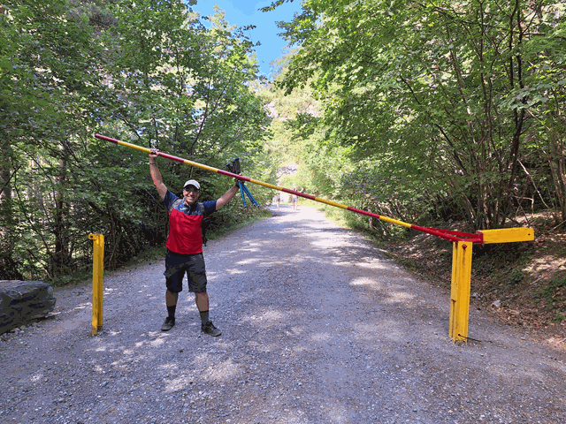 Terminado el breve descanso, retomamos la pista y nos dirigimos hacia el coche. Nos volvemos a encontrar con la barrera que impide el paso de vehículos hacia el Coll de Ladrones, pero es totalmente ineficaz. Sigue abierta y yo me entretengo en demostrarlo levantándola.