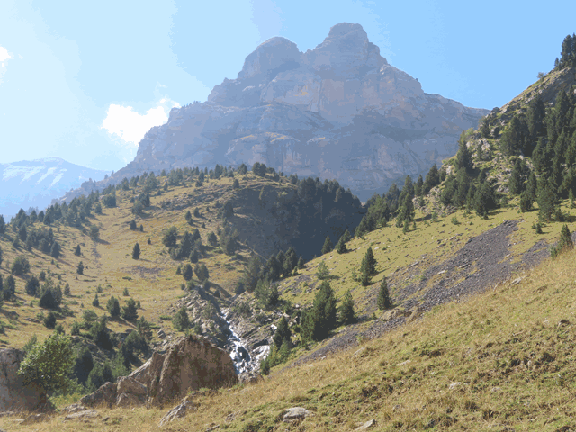 A medida que vamos subiendo, surge por nuestra derecha un torrente que baja del sector del ibón de Iserías. Al fondo, casi frente a nosotros y a contraluz, de nuevo, los Campanales de Izas, con su característico perfil rocoso. A su derecha, la gran mole de la Pala de Ip (2.779 m).