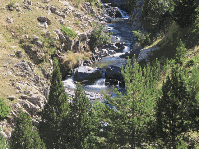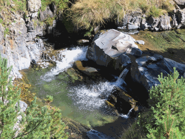 En este punto, el torrente de la Canal de Izas se ha encajonado en las laderas que lo rodean y ha formado un desfiladero salpicado aquí y allá por pequeñas cascadas.