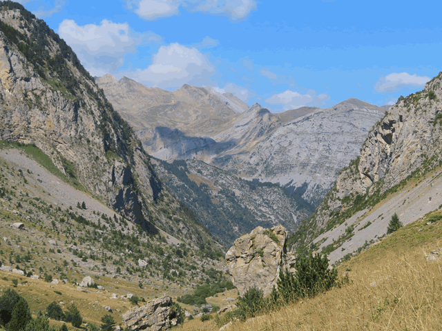 La Canal de Izas aún no es visible desde aquí, se halla casi doscientos metros más arriba. Frente a nosotros, hacia el oeste, se pueden llegar a apreciar las montañas que conforman el macizo del Aspe, a 2.500 metros de altitud.