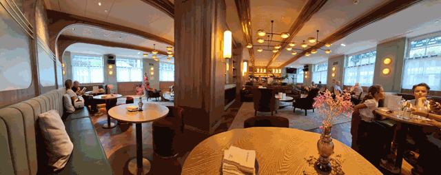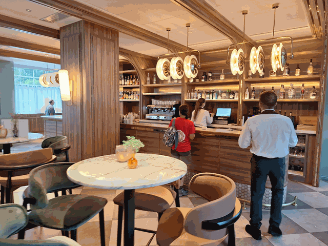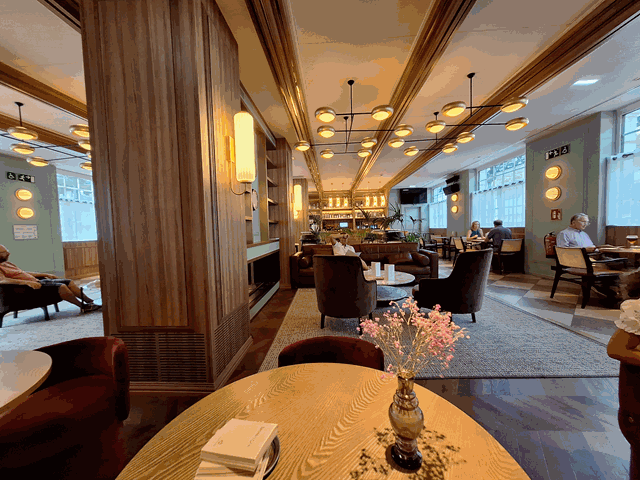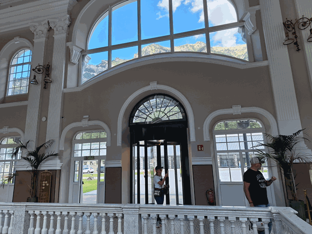 Ya hemos visitado el interior, pero ahora nos gustaría tomar algo en la cafetería del Hotel y de paso echar un vistazo. No sabemos si al no estar hospedados nos dejarán pasar, y además vestidos con la ropa de montaña. Preguntamos. Un empleado nos dice que esperemos un momento, que lo tiene que consultar. Desaparece por una puerta que da a la cafetería. Al rato vuelve a aparecer y nos dice que podemos entrar. Perfecto.