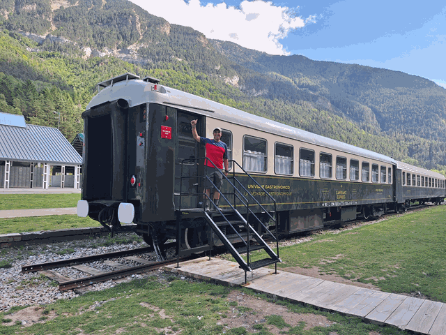 Al salir vemos que se han conservado algunos vagones de los antiguos trenes, como el vagón restaurante, donde subido me hago una foto. También algunos elementos de la antigua estación, como el tubo para reponer agua a las calderas de las máquinas de vapor o algunos cambios de agujas.