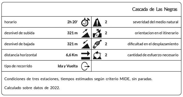 Tras apenas 1 hora y media de recorrido y habiendo salvado un desnivel positivo de unos 380 metros, alcanzamos finalmente la parte superior de la Cascada de Las Negras. Digo superior porque también está la opción de ir primero a la poza que forma el salto de agua, descendiendo por una senda que sale a la izquierda del camino.Luego bajaremos.