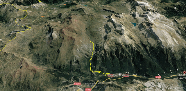 Comenzaremos en las proximidades de la población de Canfranc Estación. Para llegar allí desde mi ciudad -Zaragoza – tomaré la autovía A-23 hacia Huesca y una vez atravesado el puerto del Monrepós llegaré a Sabiñánigo desde donde nos dirigiremos a Jaca y a continuación por la N-330 entraremos en el Valle del Aragón dirección Somport hasta llegar al pueblo viejo de Canfranc, que pasaremos, para enseguida llegar a la impresionante Estación de Canfranc.
