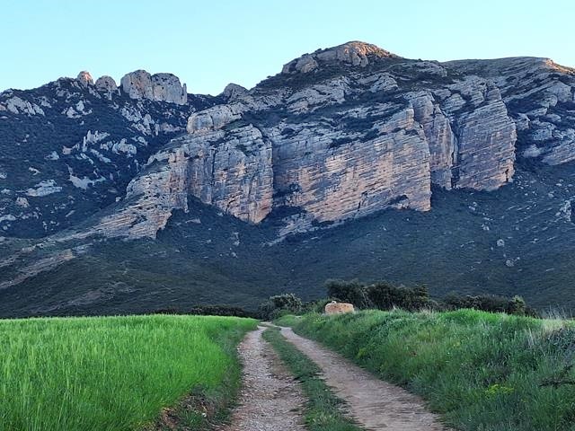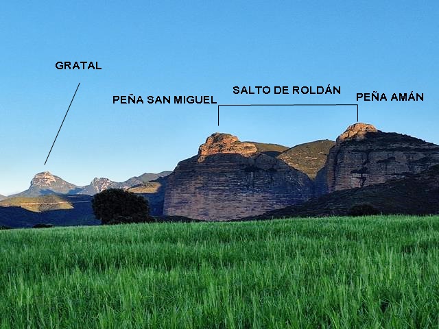 Entramos en una pista de tierra que en esta época del año discurre entre verdes campos de cereal hasta donde alcanza la vista. Frente a nosotros se levantan los imponentes paredones rocosos de la Sierra de Guara. A nuestra izquierda se ve el pico Gratal, y a continuación, hacia la derecha, el Salto de Roldán formado por las Peñas San Miguel y Amán.