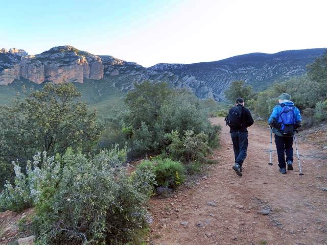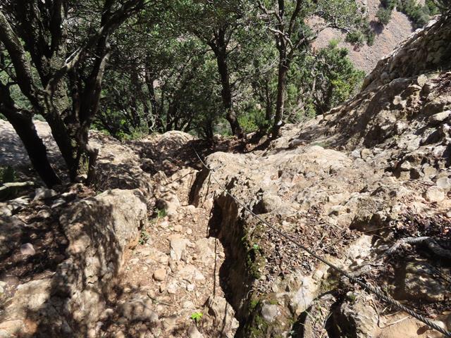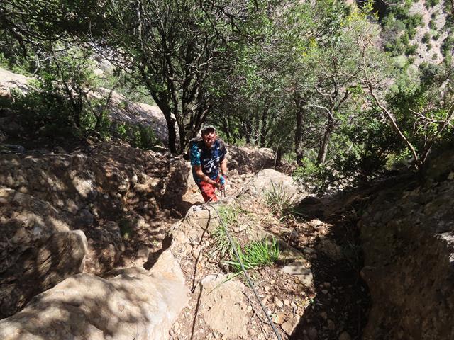 ¿Qué impresión me ha dado el descenso desde el collado de San Salvador a la ermita? Pues deciros que la senda desciende en general con una fuerte pendiente hasta el fondo del barranco, haciendo de vez en cuando algunas lazadas sobre el terreno pero otras veces bajando de manera más directa. Sobra insistir en que debe hacerse con precaución y sumo cuidado. La sirga ayuda bastante a bajar, pero hay que saber agarrarse a ella y mirar bien por donde pisas. En general, no hay peligro si se presta la atención debida.