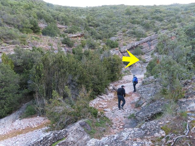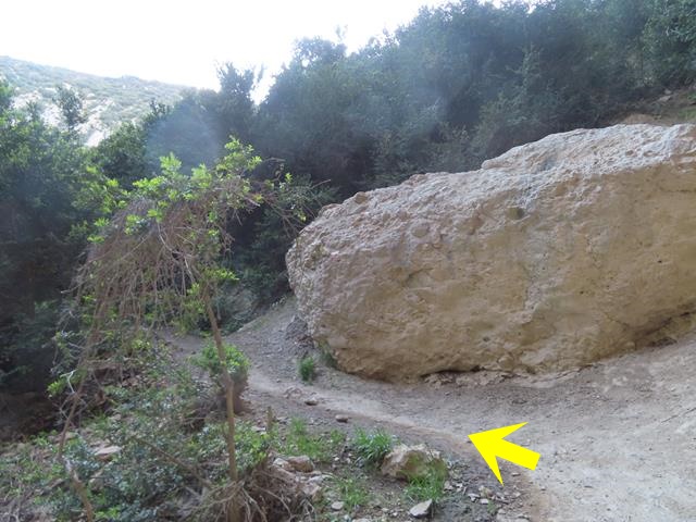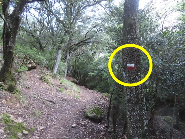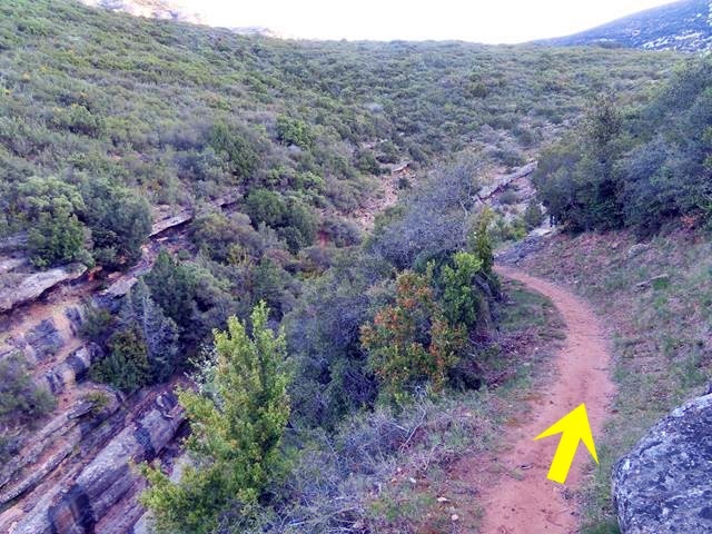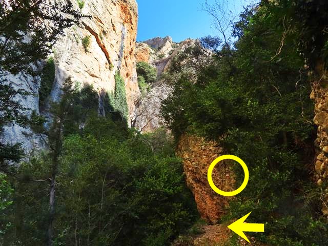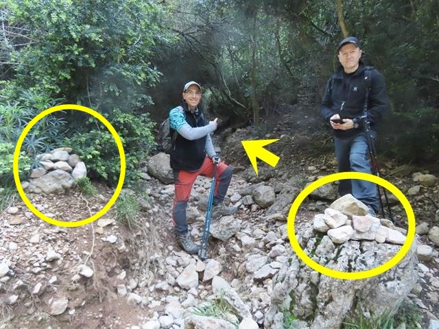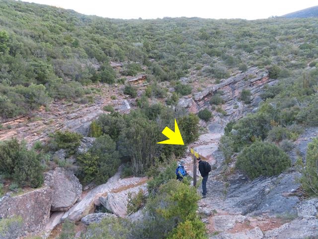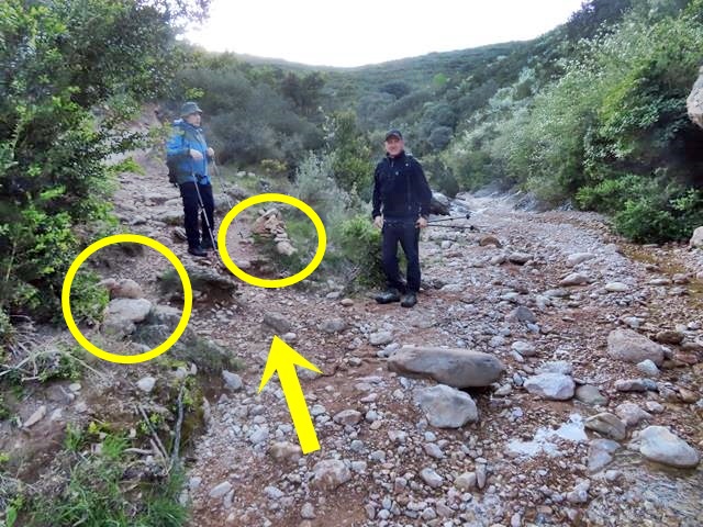 Pasado este punto hay que estar muy atentos a los mojones porque la senda sale del cauce y, ahora sí, lo cruza subiendo suavemente por la ladera. No hay que continuar recto por el lecho. En la foto de debajo os lo indico. El mojón en el círculo amarillo, y la flecha, indican la dirección de la marcha que hay que tomar. Con un aspa roja, indico por donde no hay que ir. Más de uno se ha despistado y ha seguido caminando recto.