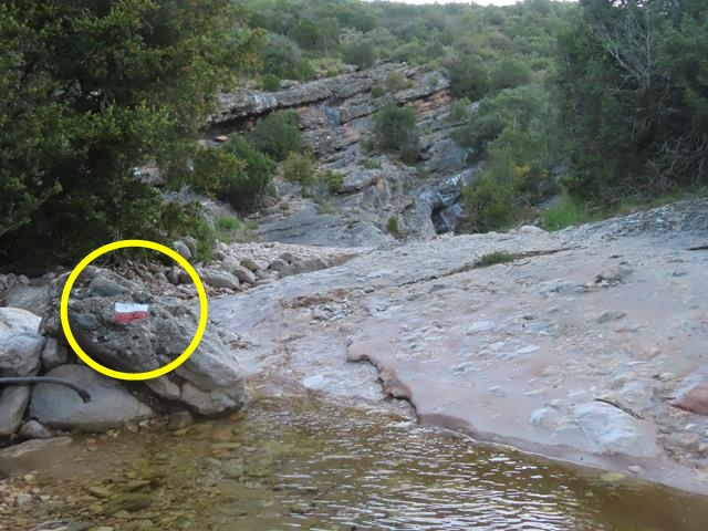 Puedo apreciar las marcas rojas y blancas del GR (gran recorrido) sobre una roca a mi izquierda. Vamos progresando por el cauce, seco en su mayor parte, salvo por alguna lámina de agua como la que aparece en la foto.