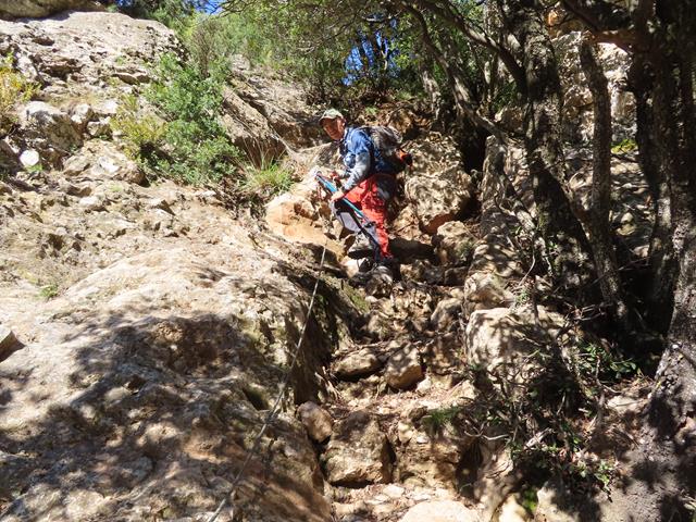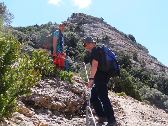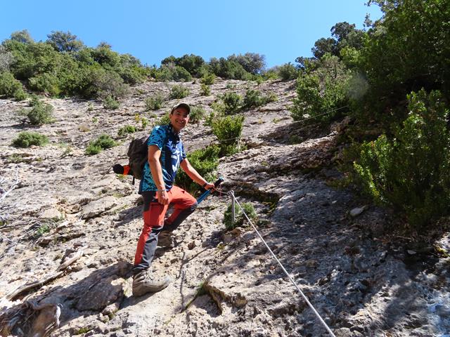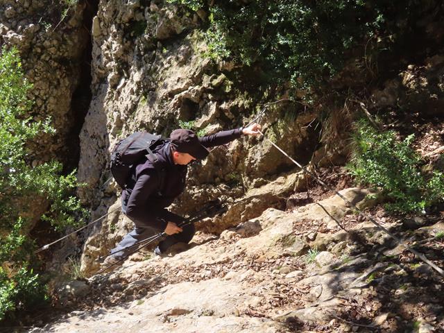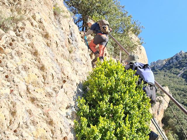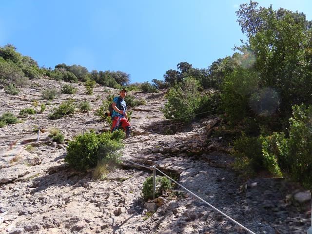 Voy el primero, así que como buena avanzadilla voy avisando de lo que me voy encontrando. Justo en el punto en que la senda gira hacia la izquierda siguiendo el contorno de la roca, un arbusto ha encontrado su hogar, pero ¡que mal nos viene a nosotros! se hace preciso rodearlo para seguir subiendo. Menos mal que, aunque no se puede agarrar la sirga, (la tapa el arbusto), sí se puede utilizar un pasamanos que han colocado en el lado derecho y que parece bastante firme y seguro.