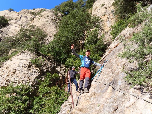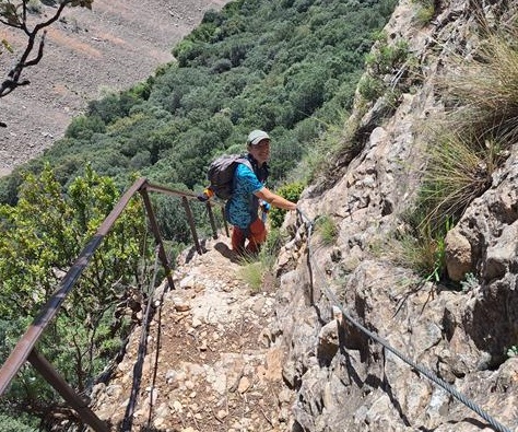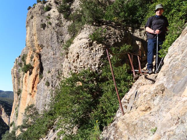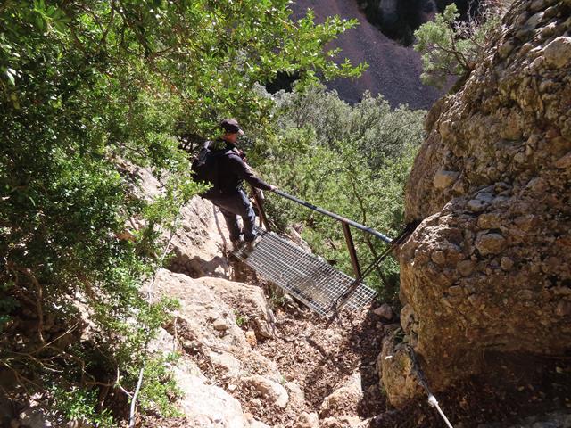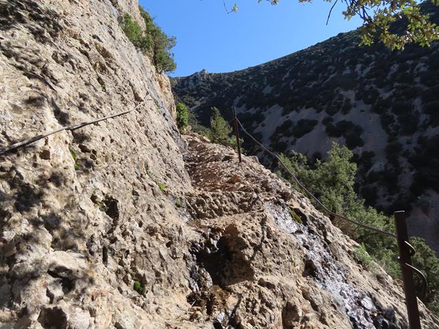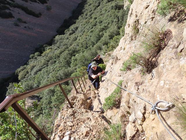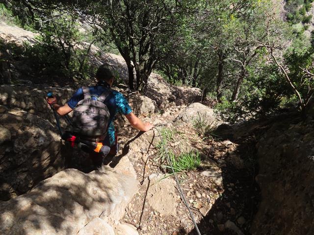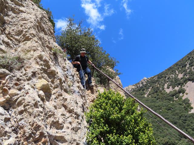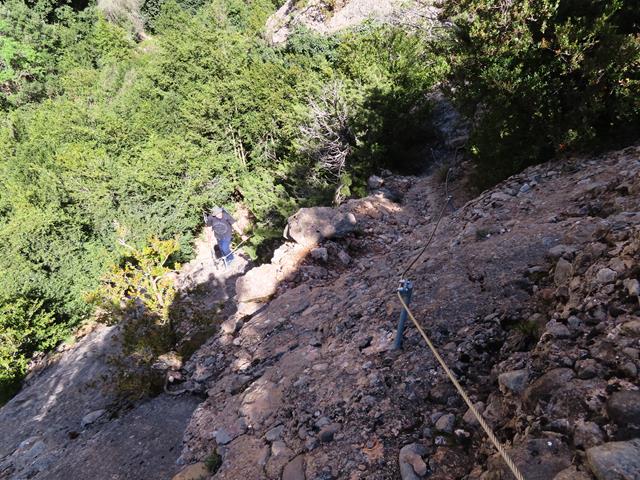 De nuevo la senda presenta una gran inclinación sobre la pared de roca, poniéndose casi vertical, pero contamos siempre con la ayuda de la sirga. También hay algunos escalones en la roca, lo que facilita el progreso sobre la misma.