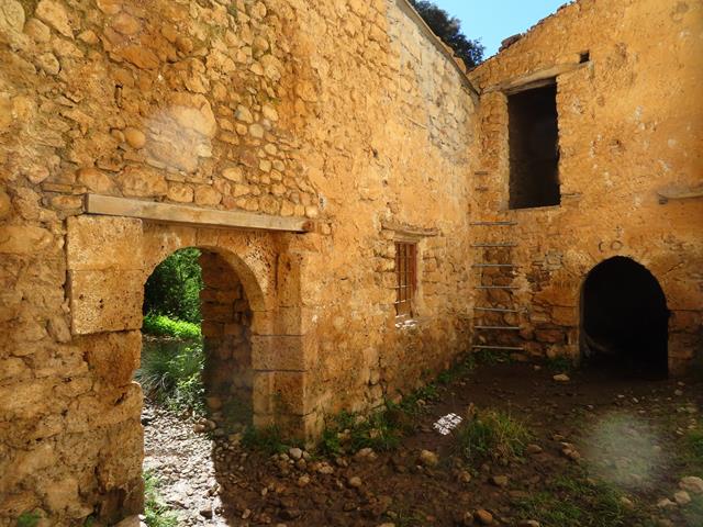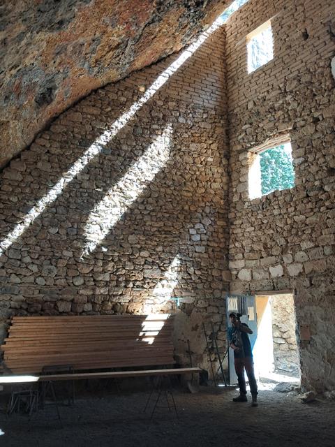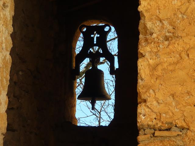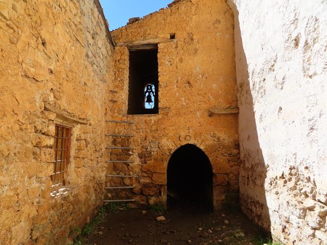 Traspasamos el arco de entrada y un espacio no muy grande nos recibe. Está a cielo abierto. A la izquierda otra construcción, con otro pequeño arco de entrada y una especie de ventana, donde al fondo, se adivina una campana.Se puede acceder subiendo por unas clavijas de hierro colocadas en la pared. Ángel sube a tañirla. Mientras lo hace, te sientes transportado a otra época y te puedes imaginar como sería la vida en el monasterio que aquí hubo.